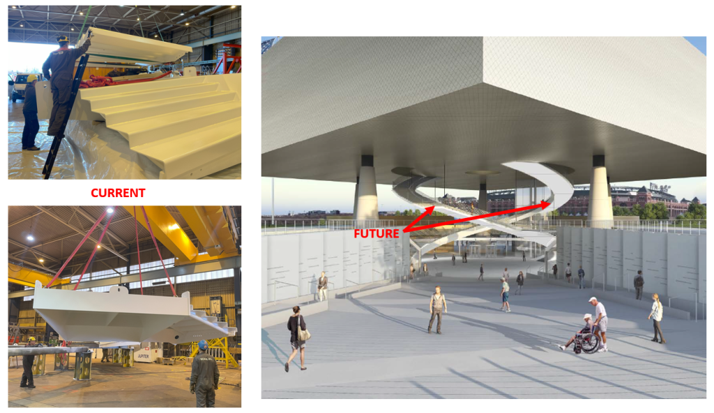 The Spiral Stairs are currently being fabricated by AIP Partners based in Rotterdam, Netherlands (current pictures of the spiral stairs in the Netherlands (bottom left pictures)). AIP Partners is a part of shipbuilder IHC which utilized specialized technologies and machinery to fabricate the complex geometry of the spiral stairs.