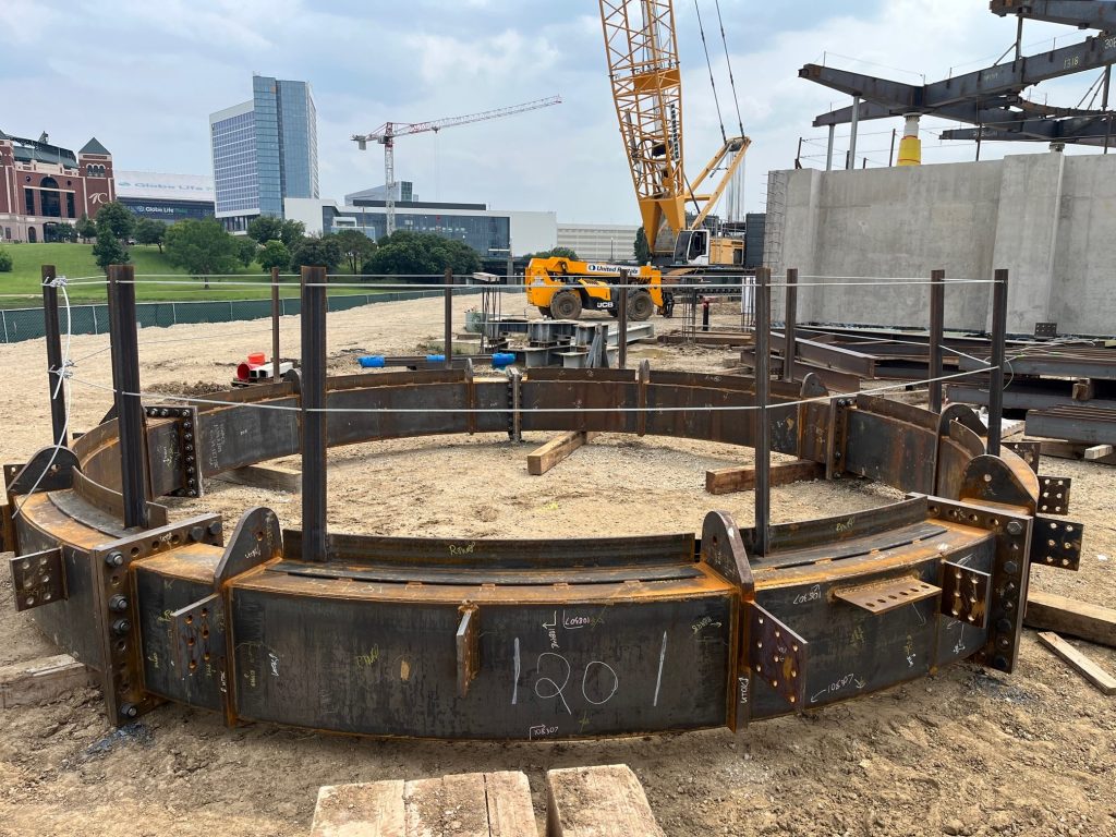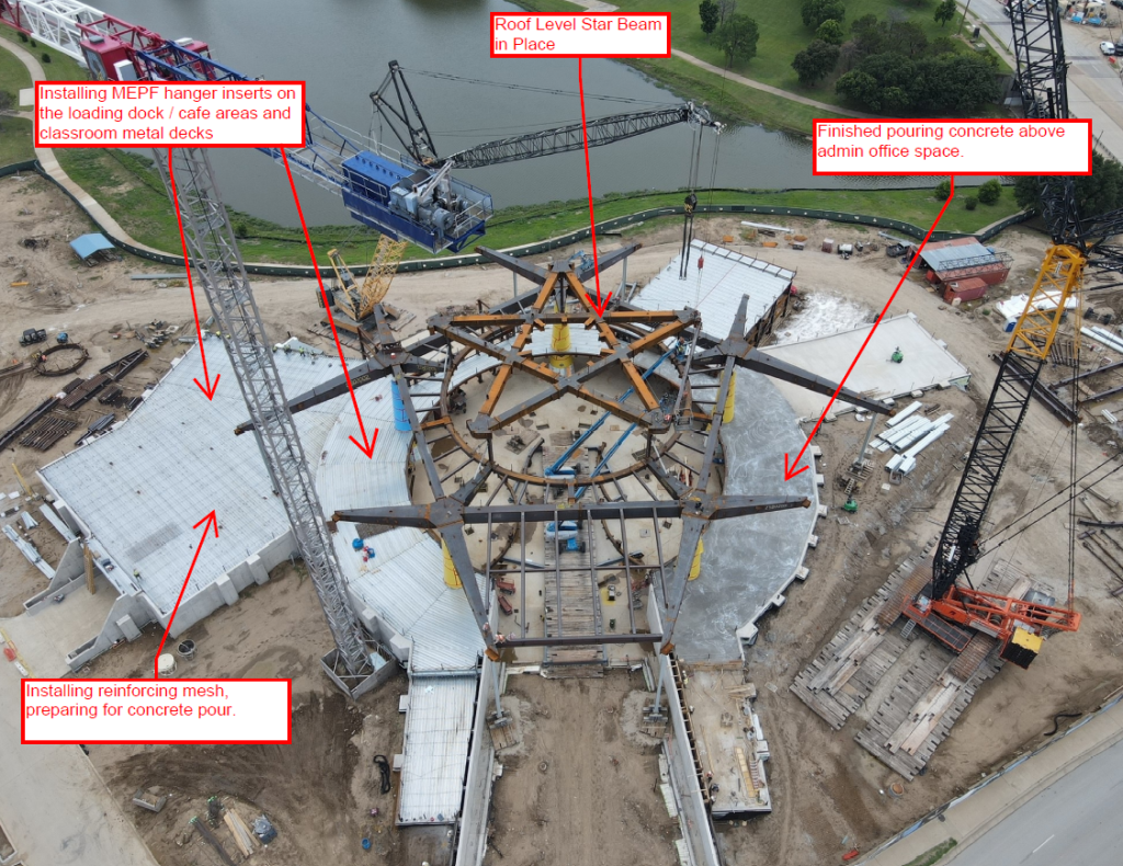 Featured in the progress image below is the oculus, the round opening in the museum’s Exhibition Hall. The inside radius of the oculus beam is 23’ and the total weight is approximately 12 tons or 24,000 lbs. The ‘Star’ creates the exact framing configuration for the oculus ring.