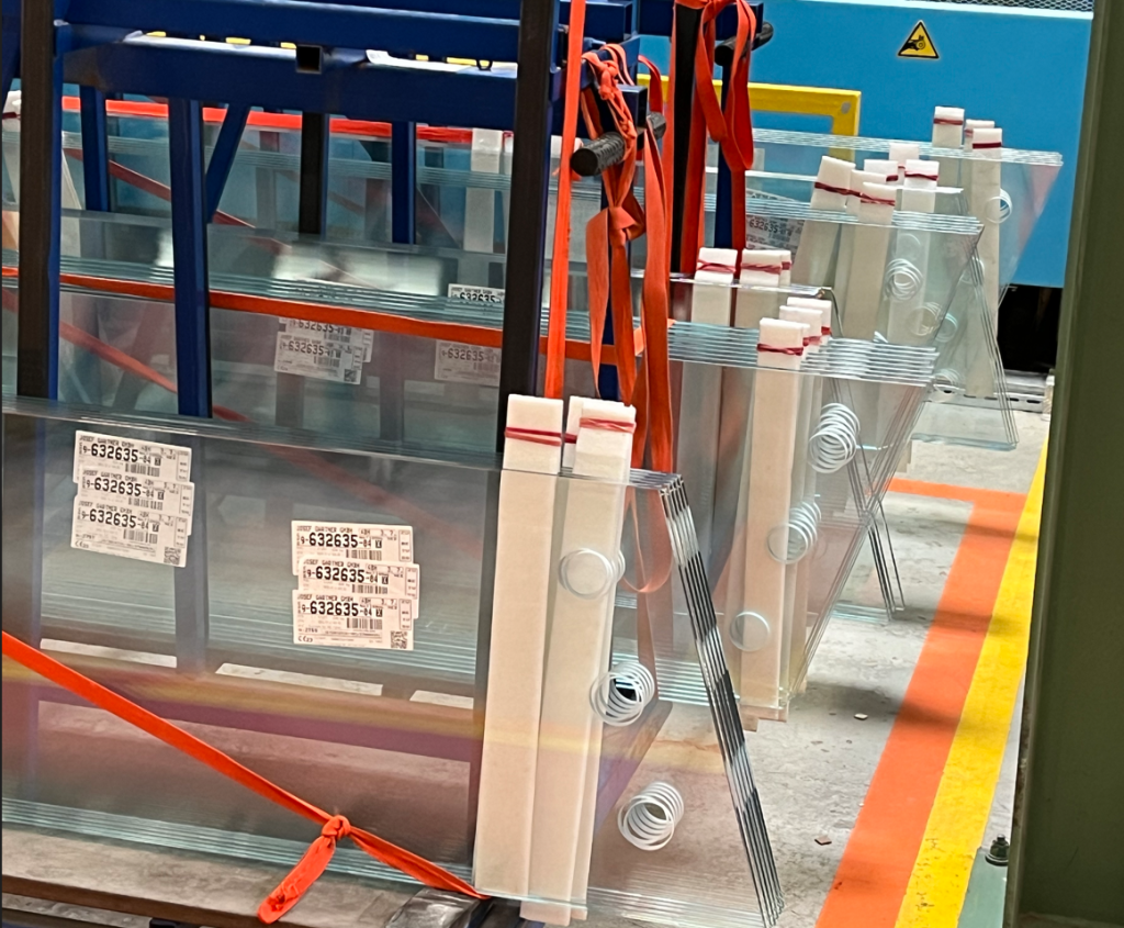 While steel erection continues at the construction site, there are exciting things happening off-site in preparation for the dramatic structural glass elements future arrival at the Museum. A recent trip to Germany and Austria allowed the team to approve the fabricated glass elements for delivery to the NMOHM. The first glass elements are anticipated to arrive at the site at the end of July. Seen in images (below):