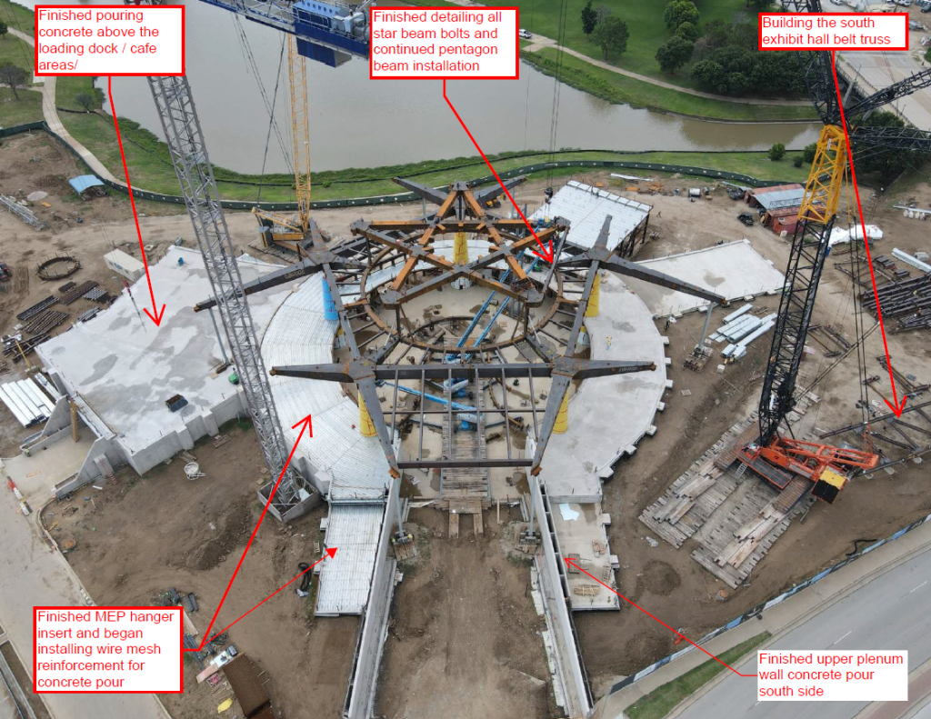 - Finished detailing the star beam bolts and continued installing the pentagon beams.
