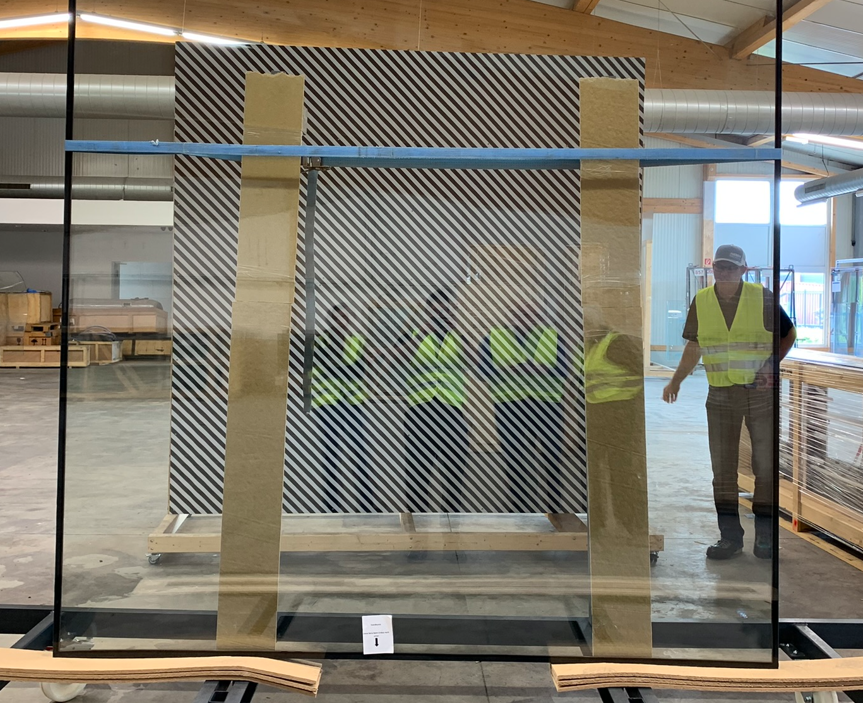 Picture 2: Largest single piece of curved glass (lakeside amphitheater) being viewed with a “zebra board” to reveal possible distortion. This piece is 7’ wide and 16’ tall and weighs approximately 2200 lbs.