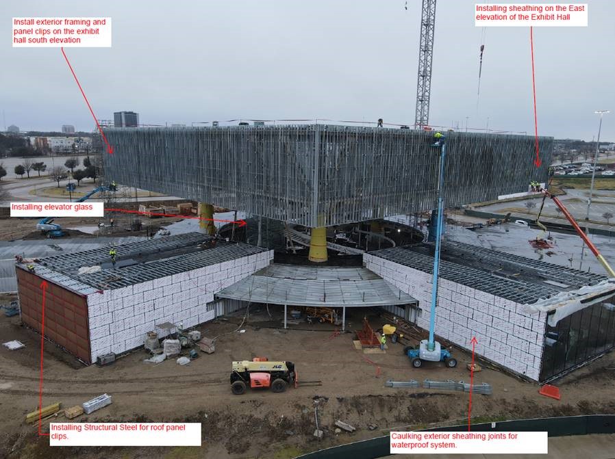 - Installing exterior wall framing clips on the Exhibit Hall.