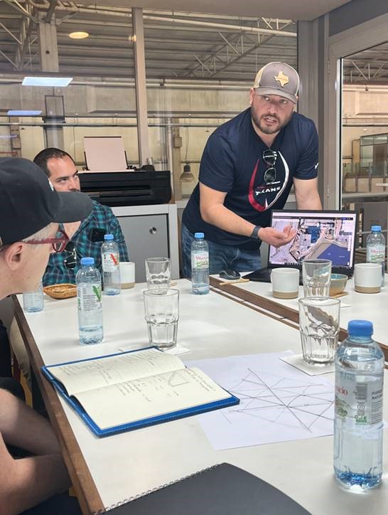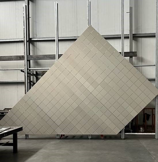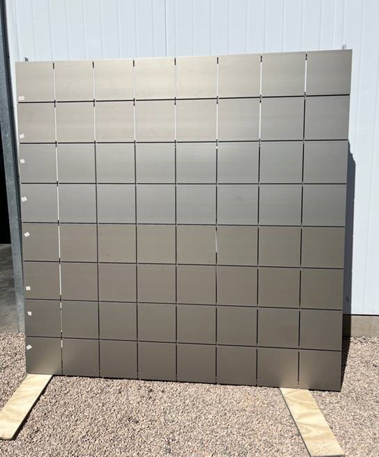 Buenos Dias from Argentina! This week we traveled to Buenos Aires to review the completed panels, in process fabrication, and conduct a test “fit up” and installation training at the Dante Tisi plant. Dante Tisi will begin delivering panels to the jobsite at the end of February. The images below show one completed panel (+/- 150 lbs.) of the 3930 panels that will be used to clad the Exhibition Hall. The mockup was used to test the installation process which will include a crane to support the panel while 4 persons (in boom lifts) align and install each panel.